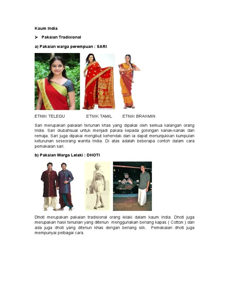 Ia merupakan kemeja panjang yang sampai ke lutut dan lazimnya diperbuat . Title slide of pakaian kaum india. Pakaian tradisional wanitasarimerupakan pakaian untuk kaum wanita dan ia adalah pakaian seharian dan turut dipakai pada musim perayaan. Budaya dan tradisi masyarakat india. Dhoti diperbuat daripada lembaran kain putih yang panjang. Jom kenali pakaian tradisional kita.